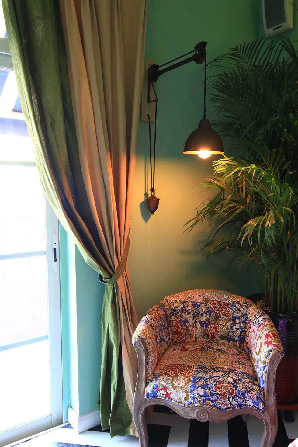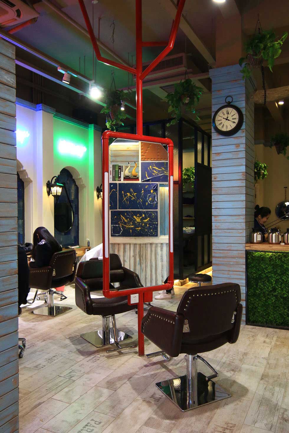發型區的設計,保留原有建筑的結構,通過鐵藝隔斷做了一個空間分隔,留有一個洗頭區,是功能性更加合理,同時落地式的實木造型鏡子和北歐壁紙,則把整體效果渲染的緊湊而充滿藝術氣氛,和文藝青年喜歡的特質。