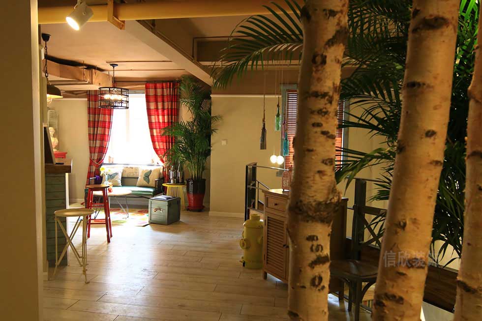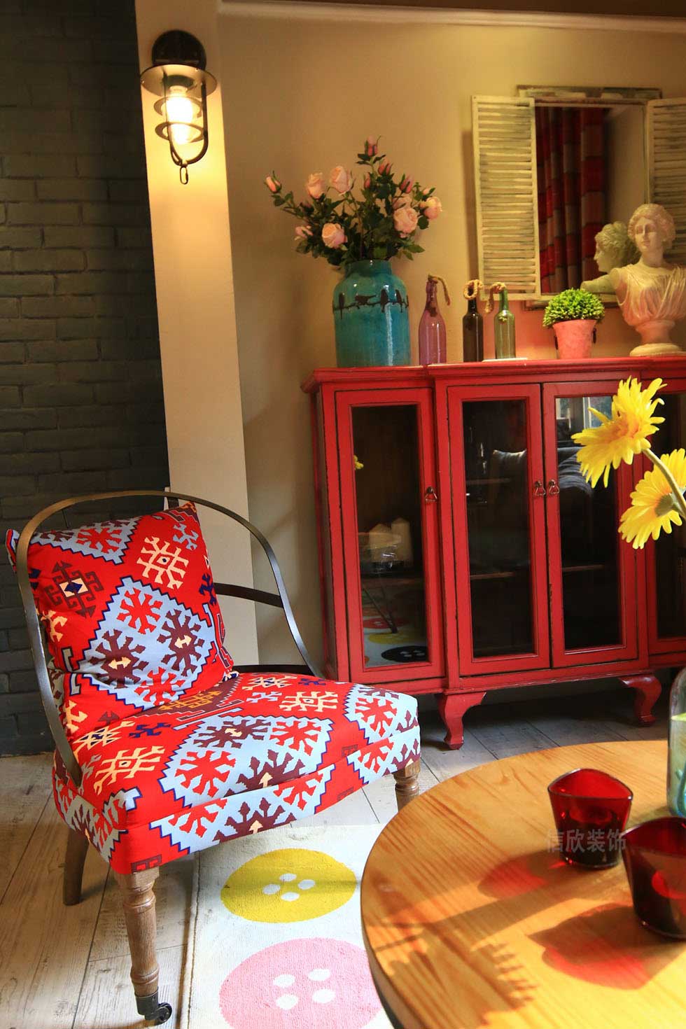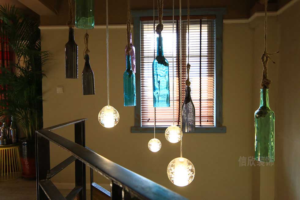 原木色的地面,手工制作的鐵藝小皮沙發,結合各種手工的柜子,茶幾,鐵藝吊燈等元素,非常有一種古舊但是溫馨的家的感覺,也符合北歐風的環保和綠色的生活理念。