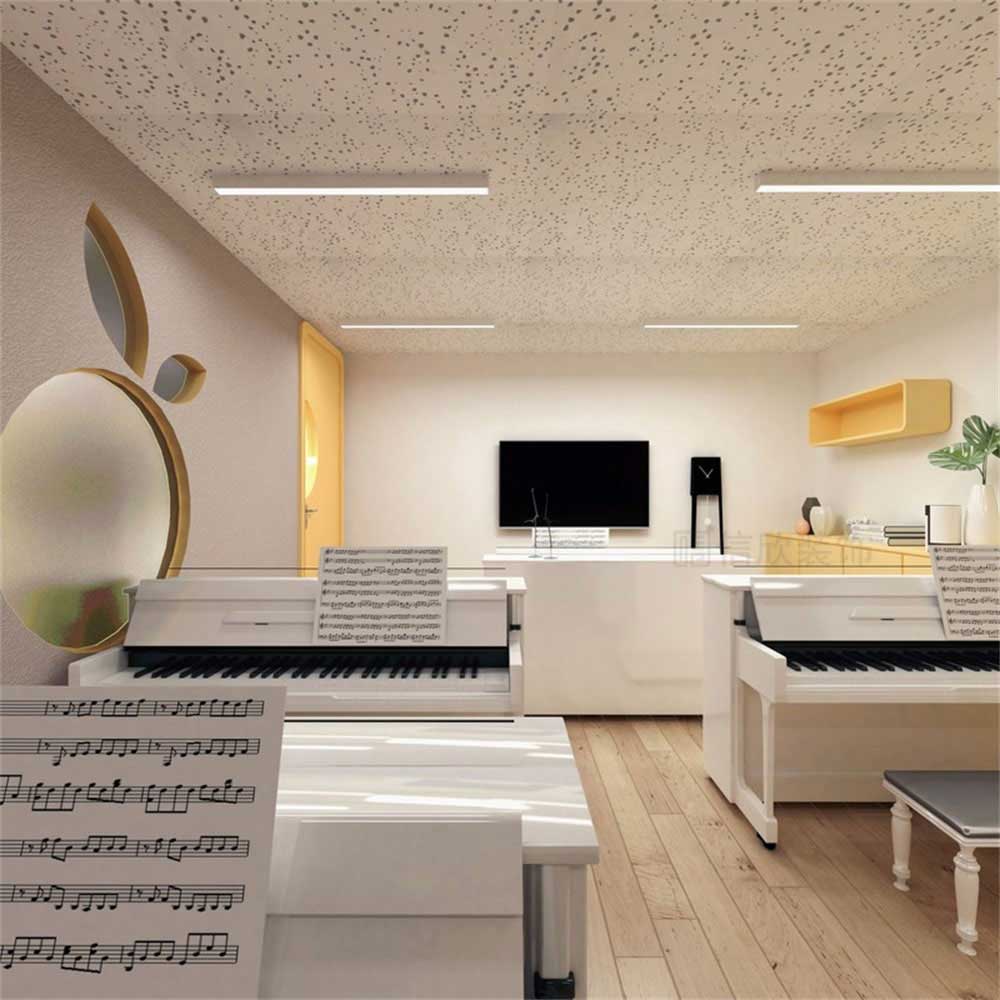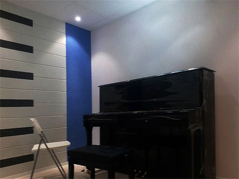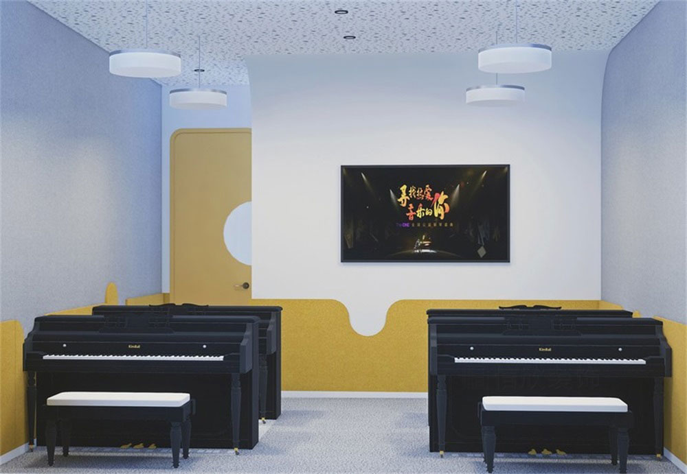 灰白色為主題的鋼琴教室,橙色為點綴,配合弧形的吊頂,既保留了音樂殿堂的嚴肅莊重的氣氛,又體現了超脫和跳躍,不拘一格的設計感。
