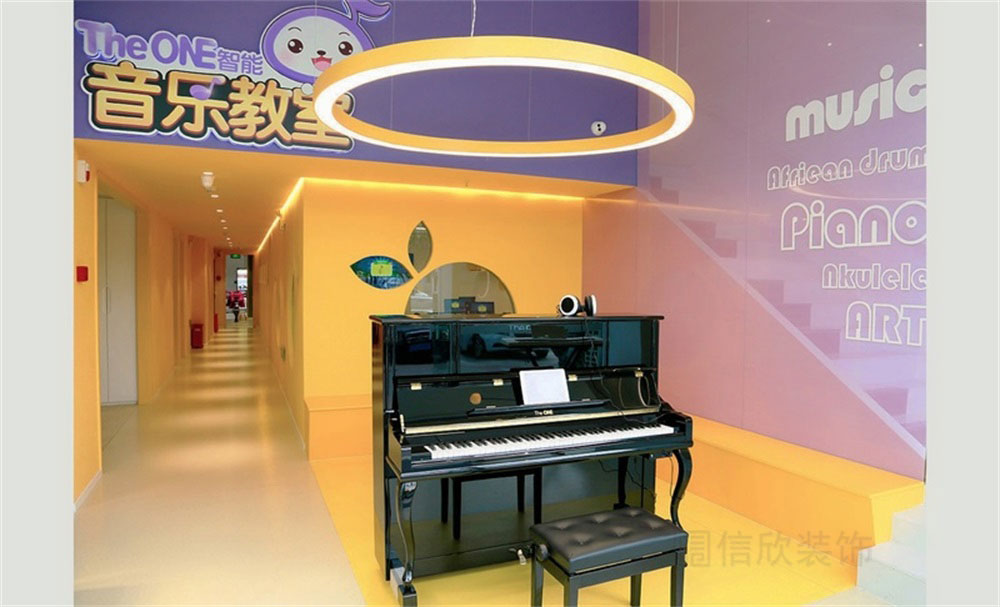 深圳市福田區音樂培訓教室樓梯頂面鋼琴鍵盤一般的樓梯,讓人走在上面如同可以帶出美妙的音符般神奇,七彩氣球造型的頂燈,使人一見傾心,忘卻塵世中的煩惱,仿佛時刻提醒你,再忙也別忘記,生活是甜的。
