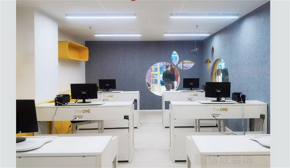 灰白色調為主題的大課室裝修設計,顏色簡單明了,個性鮮明,墻體的黃色造型和置物架;讓人在沉悶的學習中,注入了夏天的活力。