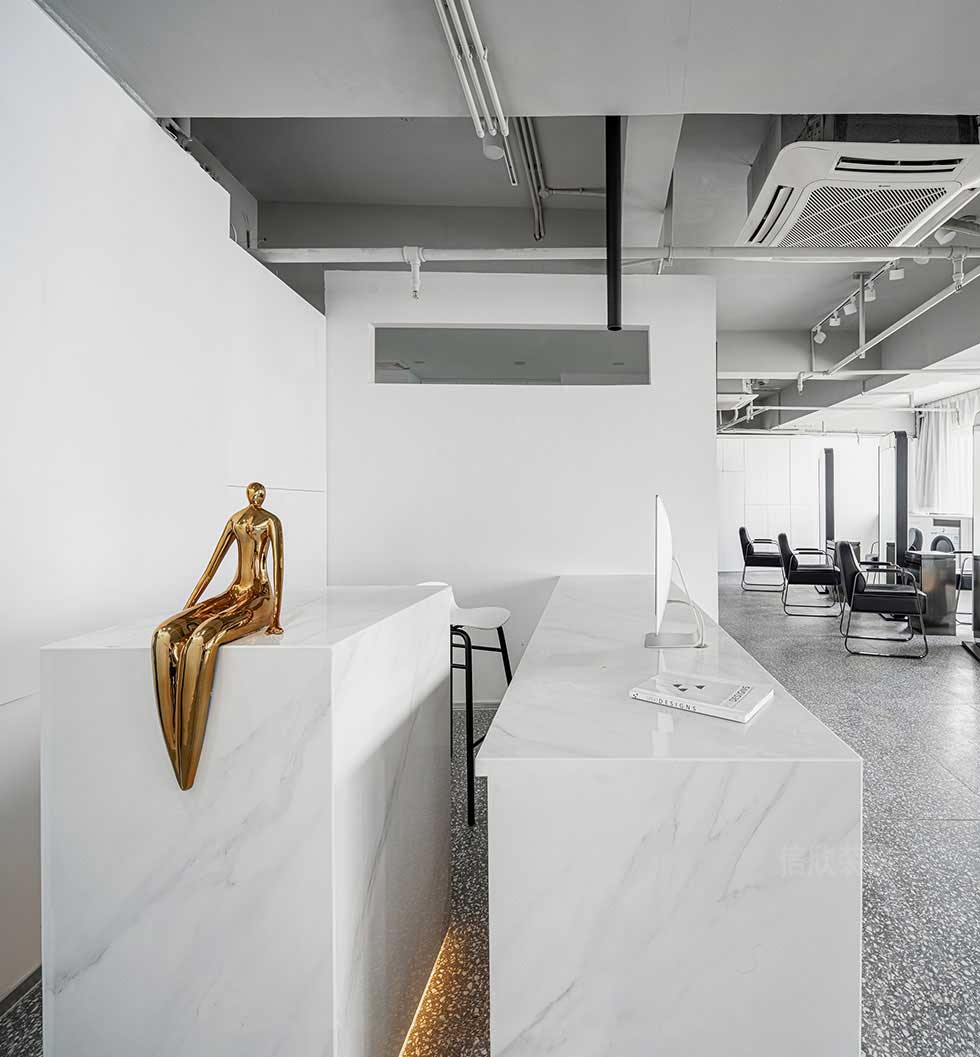 前臺和內部空間做了一個區(qū)分和間隔,增加一些背部的神秘感,和空間引入的一個效果,白色的前臺用立體效果的背景墻,白色大理石紋理和燈條的設置,簡單中卻不平庸,富有高雅的質感。