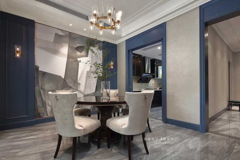餐廳與客廳毗鄰,深木色的精致圓形餐桌,米白色的餐椅與背景墻畫呼應,讓整個一層的設計空間更加合理且精致。