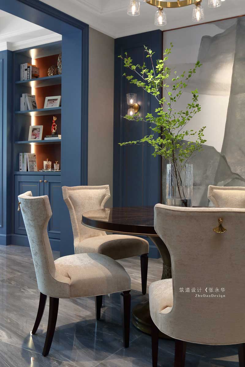 餐廳與客廳毗鄰,深木色的精致圓形餐桌,米白色的餐椅與背景墻畫呼應,讓整個一層的設計空間更加合理且精致。餐廳與客廳毗鄰,深木色的精致圓形餐桌,米白色的餐椅與背景墻畫呼應,讓整個一層的設計空間更加合理且精致。