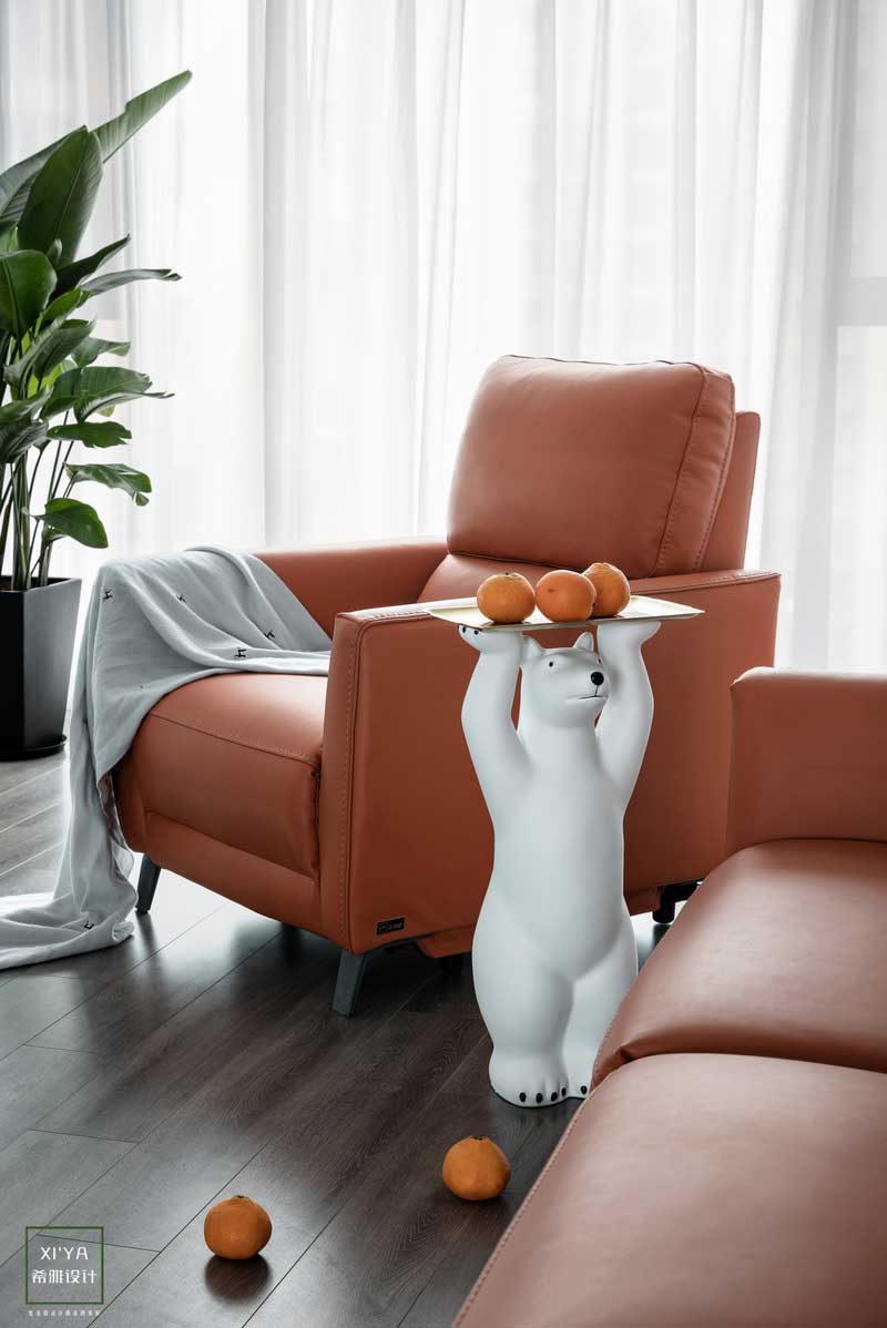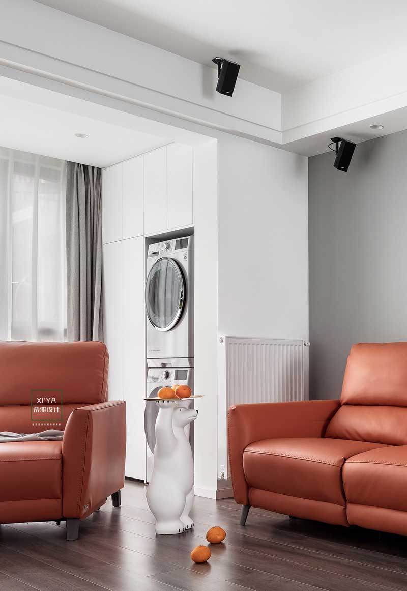 白色的墻面,咖啡色實木紋理的地面,搭配上皮藝的沙發,給人一種自然原始的現代北歐風情,橘紅色的顏色設計,讓白色的空間,注入了一絲活躍靈動的氣氛感。