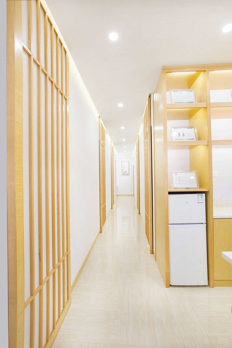 深圳寶安130平方美容院走廊裝修設計 純白色的走廊,很有創意的加上中式風格的木藝屏風隔斷,使其看上去對稱性強,顏色對比更鮮艷,素雅的格調,明亮的場景中,透出一股書卷氣和文化的內涵。