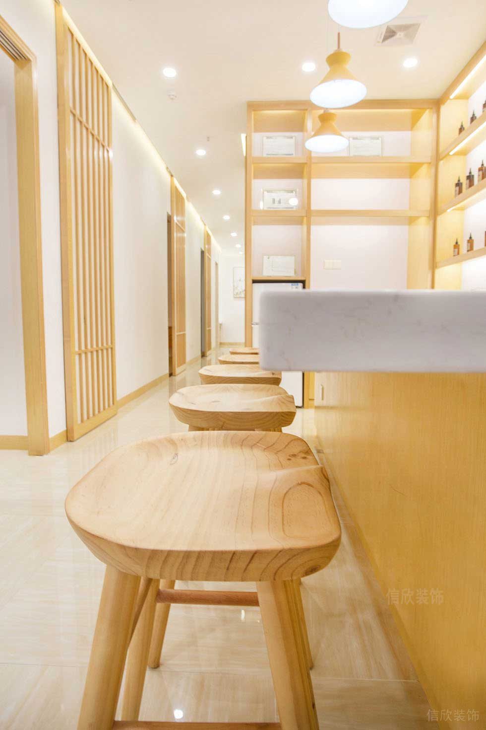 深圳寶安130平方美容院展示區裝修設計 展示區的裝修設計,原木色加白色大理石臺面的中島柜和原木的展示柜為主,在暖色燈光的照射下,凸出產品的精致感,北歐式的手工吊燈,讓整體氣氛充滿家的柔情和溫暖。