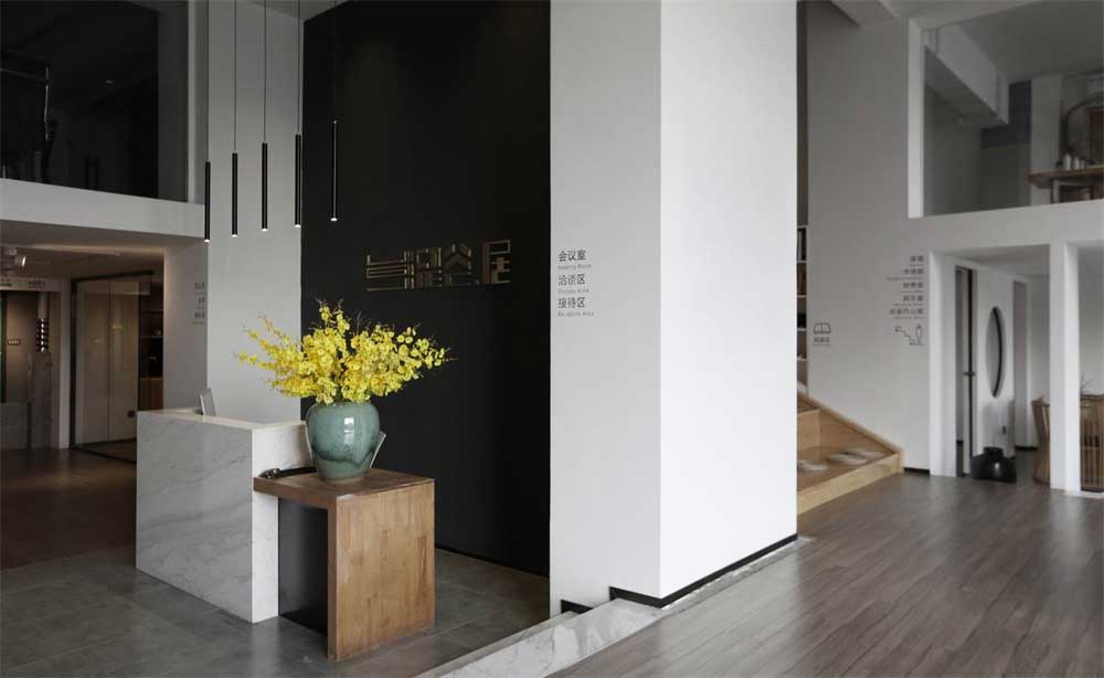 新中式辦公室前臺的設計,灰色大理石地面,黑色硬包背景墻,搭配延伸出島臺的前臺,優雅而富有美感。