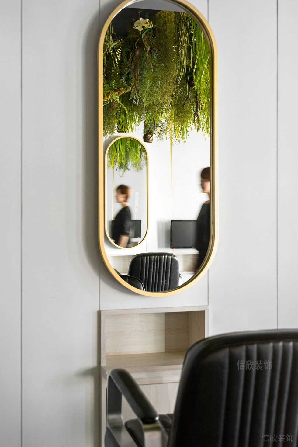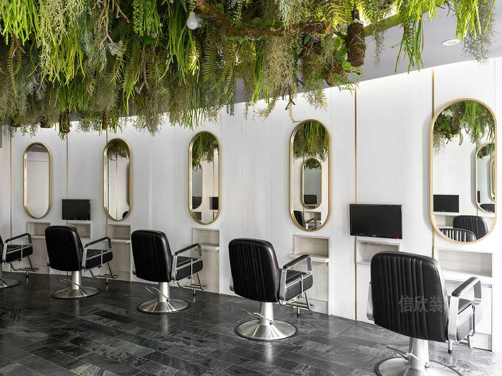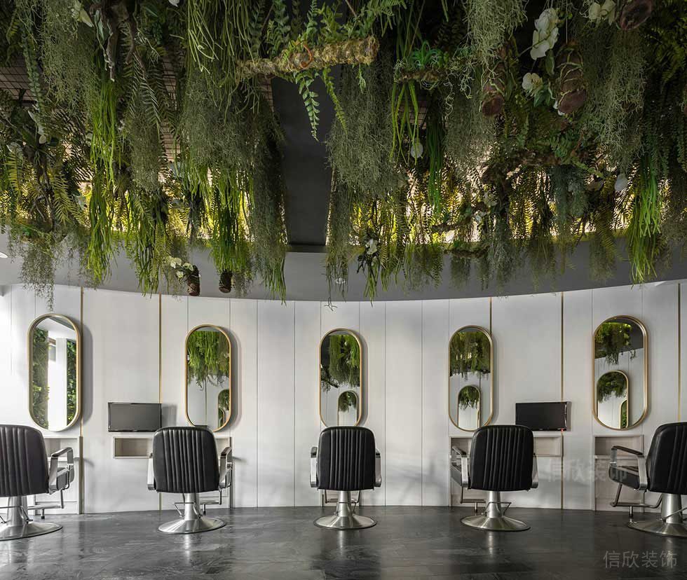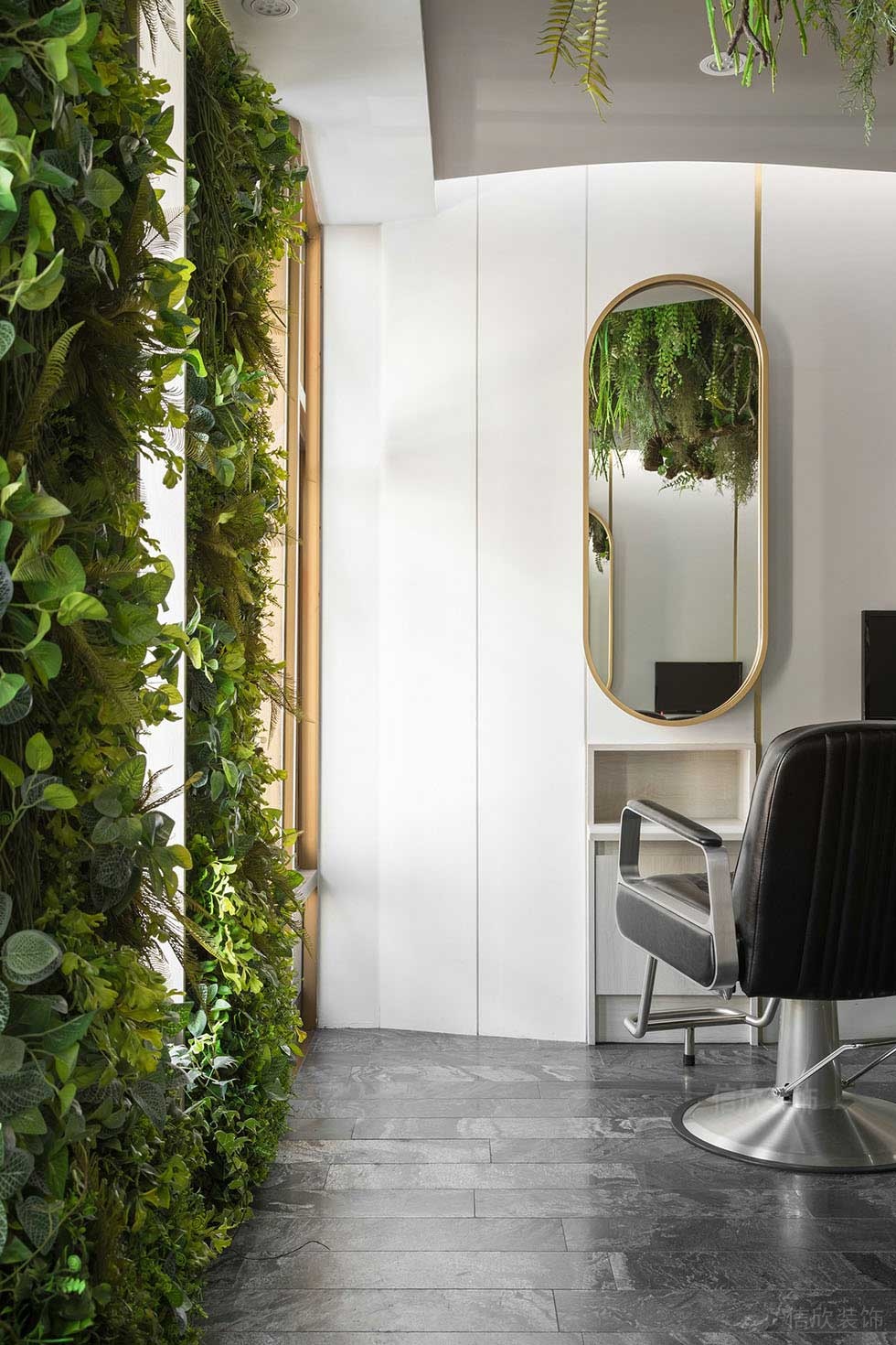 造型區的設計,采用直通式 的處理手法,頂部是下垂的綠植,給人的感覺比較自然和清新,而在一個個金屬邊框小鏡面的反射下,空間的立體感又能得到很好的提升效果。