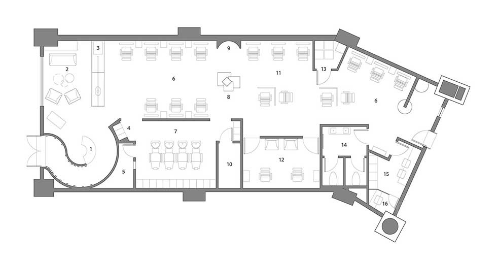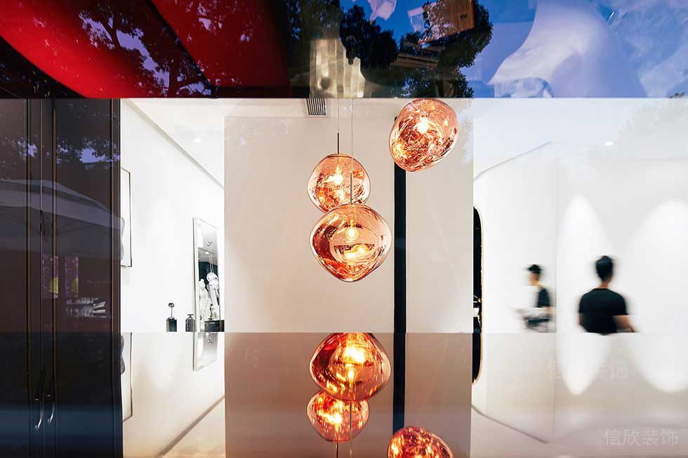 理發區是一個全開放的區域。整齊劃一的座位排布,形成規整的序列,搭建起理發師展現精湛手藝的舞臺。佇立在在舞臺中央的藝術雕像和懸掛在天花下的球體燈飾,則在打破這種均質關系,為整個空間注入靈動的藝術氣息。燈光照明上,設計師采用了盡量克制的方式,以理發區中央的管形藝術吊燈來提亮空間,使顧客能夠沉浸在柔和的氛圍之中。