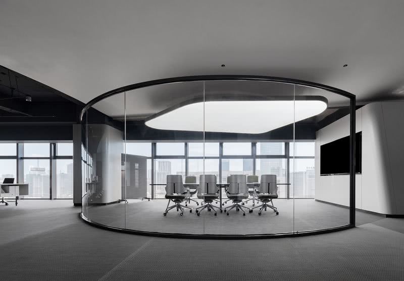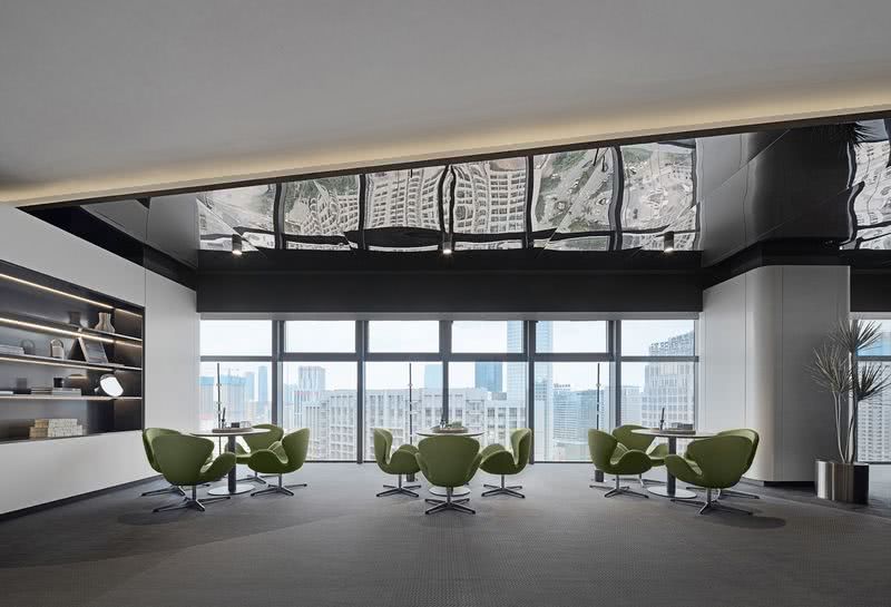 會(huì)議室延續(xù)了柔和的流線語言,設(shè)計(jì)師以全明玻璃作為區(qū)隔內(nèi)外空間的介質(zhì),而在視覺觀感上無界內(nèi)外,隱喻內(nèi)外一致的協(xié)作關(guān)系,以及恰到好處的距離感。銀灰與淺綠勾勒出空間的商務(wù)質(zhì)感,大面積幾何頂燈的亮度呼應(yīng)著暗色塊面,形成明暗層次對(duì)比以及極具當(dāng)代感的藝術(shù)畫面。 冥想花園