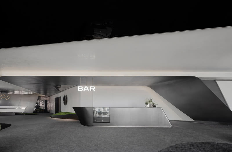 沙盤區(qū)、水吧休閑區(qū)相鄰而設(shè),一面弧形LED屏是設(shè)計(jì)師運(yùn)用現(xiàn)代技術(shù)對(duì)品牌展示的加持,亦是對(duì)流線空間中單一層序的藝術(shù)化補(bǔ)充。仿真苔蘚景觀的置入,成為點(diǎn)綴空間幾何塊面的一抹亮色,亦與淺綠調(diào)的休閑椅色溫相諧,在不銹鋼材質(zhì)的黑色鏡面天花映襯下,空間寬敞開闊,布局清晰而別具趣致。