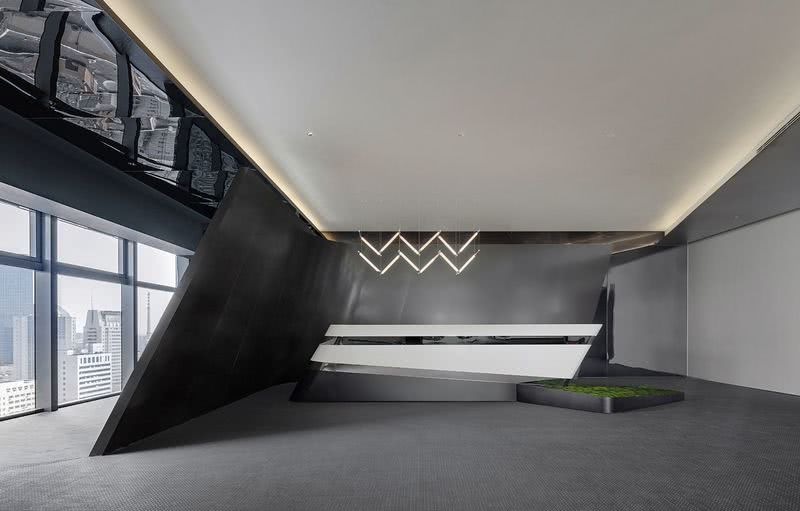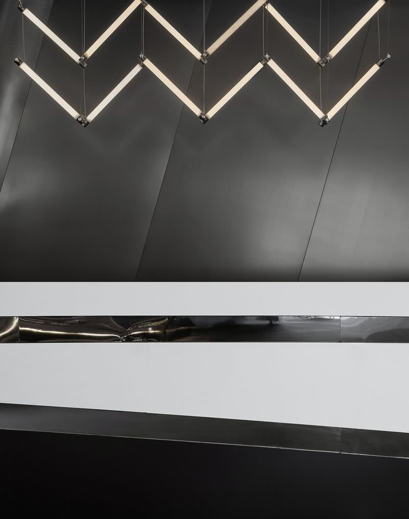 當(dāng)筆直的線條,延伸至圓潤(rùn)的弧度轉(zhuǎn)角,空間結(jié)構(gòu)上便形成了弧面的幾何視覺。設(shè)計(jì)師通過對(duì)線條的藝術(shù)化演繹,與嚴(yán)謹(jǐn)、干練的商務(wù)氣質(zhì)相結(jié)合,不僅延展出極簡(jiǎn)的藝術(shù)細(xì)節(jié),亦描摹出空間予人的第一印象 —— 自由而有序,通透而大方。12根線型燈飾排成陣列,在不同視角下,交織出不同形狀的幾何光影,與創(chuàng)意拼合的接待臺(tái)構(gòu)就豐富的層次感。