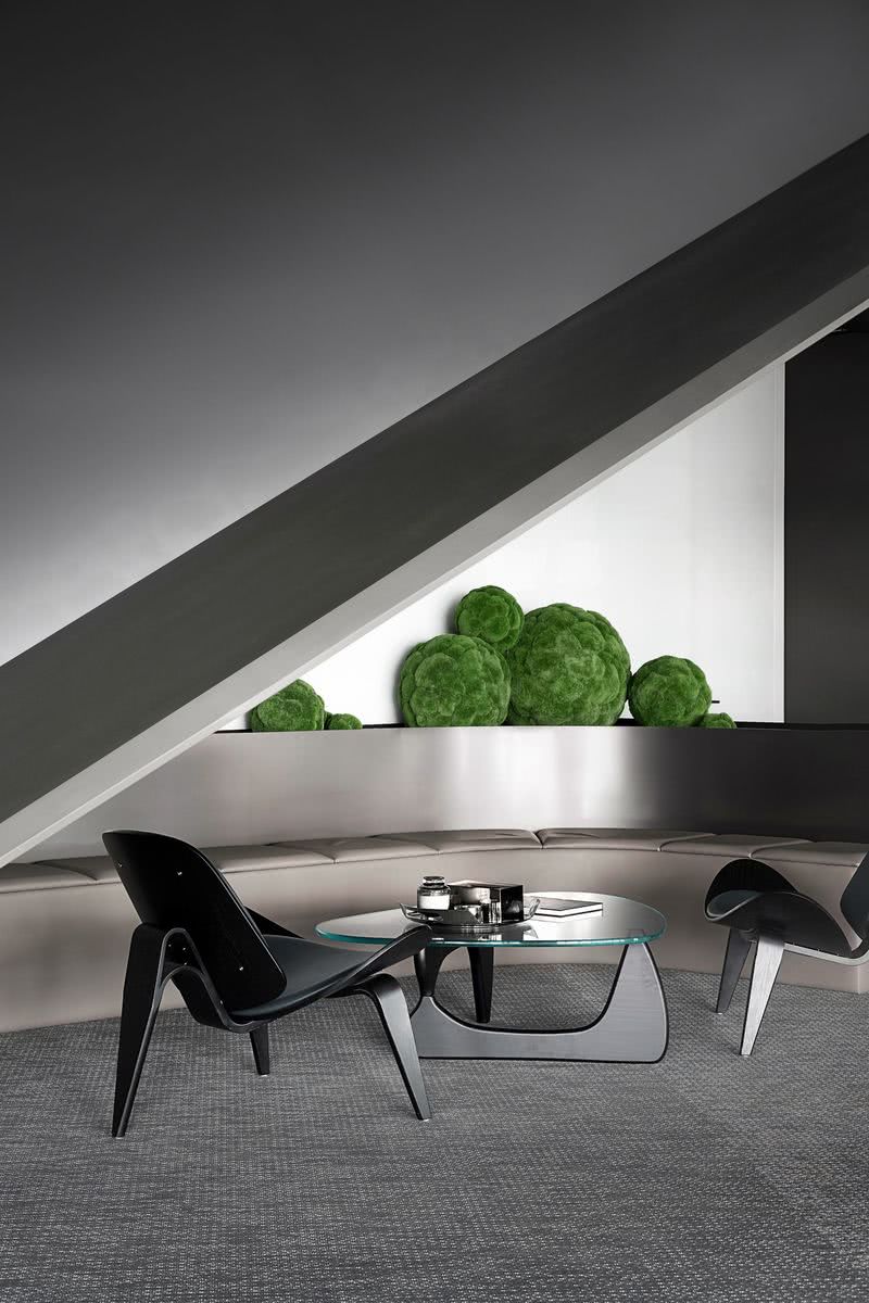設(shè)計(jì)師對(duì)于體塊結(jié)構(gòu)的妙用,構(gòu)造出一個(gè)“半隱”狀態(tài)下的冥想花園,強(qiáng)化人與空間的互動(dòng)關(guān)聯(lián),與線條同樣簡(jiǎn)潔利落的家具、修剪為圓球形的仿真苔蘚端景一起,將舒緩、寧靜的氛圍渲染到極致。 VR HUB