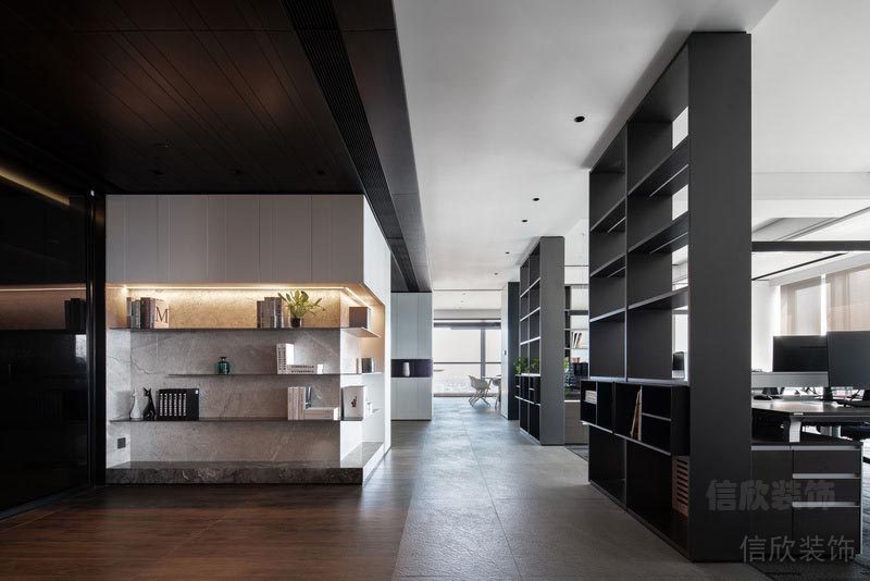 這是位于深圳市南山西麗匯城茗院的辦公室裝修實景圖,水吧區被設計成吧臺和接待區,靈感源于層巒疊嶂、云遮霧罩自然形態,營造出清新舒適的質感空間。入口大廳和前臺,奠定了高級雅致與商務穩重融洽并存的主基調。綜合辦公區兼具功能性與美感,品茶區原木色茶臺,木材與石材相結合,剛硬不失柔美。在落地窗的包容下,陽光得以眷顧每寸角落,將整體空間烘托得溫暖雅致。洽談區與水吧臺看似各司其職,實則動靜相生。筆墨紙硯文房四寶靜伏于案,茶盞置于會客幾前,黑白灰的基調上,將極簡主義高級優雅融入室內陳設。舒服的自然光,簡潔利落的室內線條,無不彰顯辦公空間的格調與品位。