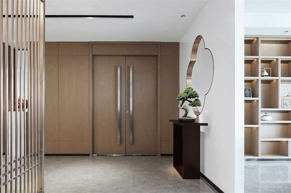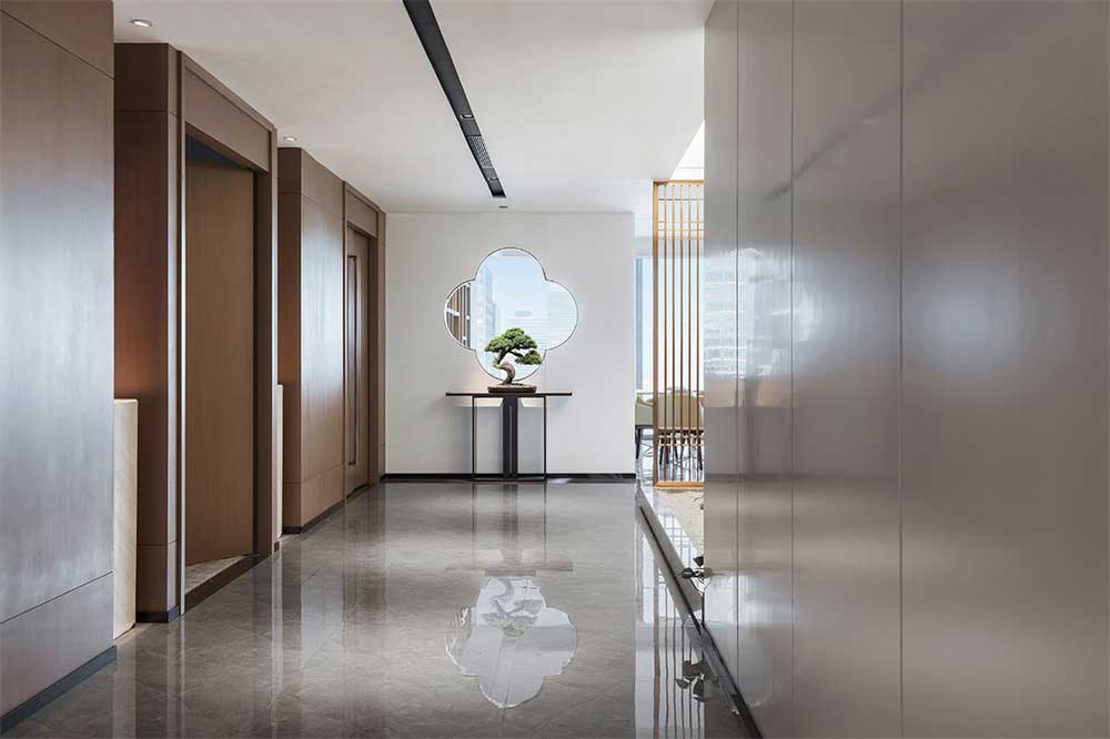 前廳空間以灰色大理石地面,白色大理石背景墻,淺色木紋的護墻板,平頂和周邊頂相結合,木材與石材結合的前臺等元素,構建出一個簡單大氣,又儒雅內斂的新中式主義前廳設計,兼具了美感與實用性。入戶的過道,采用木紋護墻板和門一體式的設計看起來風格更統一,室內的枯山水景觀,鏤空式的墻體的玄關柜則體現中式古典文化的內涵。會議室和吧臺區,以護墻板穿插中式山水畫的巧妙點綴,讓空間更飽滿,更有古風的氣息。辦公室以長條形的實木和平頂的結合,使延伸感更強。洽談區選擇在落地式窗戶的前臺,擺放上實木的家具和泡茶桌,采光和采景效果最好,一邊喝茶一邊欣賞美景,符合了唐詩中“會當凌絕頂,一覽眾山小”的豪邁氣勢。