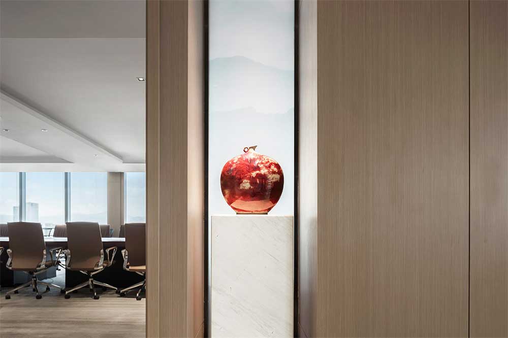 深圳市寶安1000平國中創投辦公室裝修會議室,中式月門的設計,兩邊做天然大理石瓷器展臺,更有古典文化底蘊。