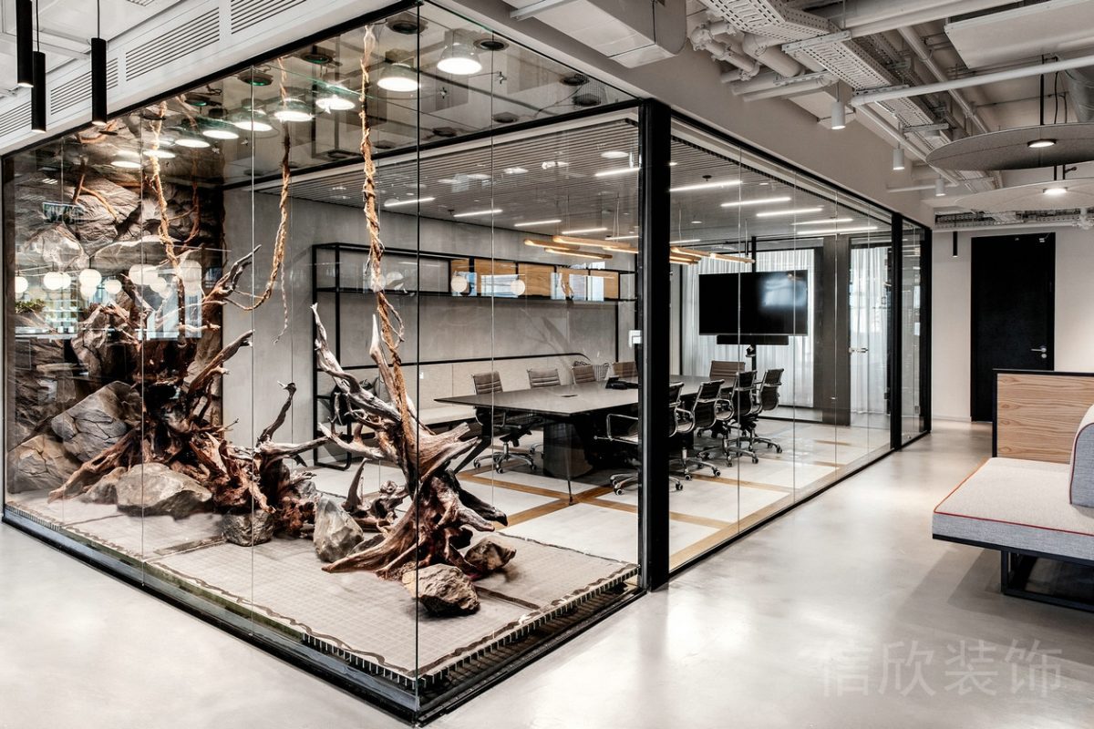工業風水泥支撐柱設計全落地式高透玻璃裝修辦公室休息區裝修圖