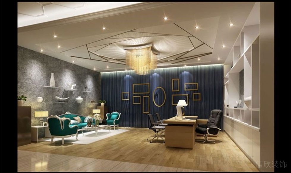 洽談室的設計,采用不規則小塊分割的頂面,極深的高度搭配石膏線條,在黃綠兩色木藝邊框,歐式沙發等元素的應用下,古典風十足,貴氣逼人。