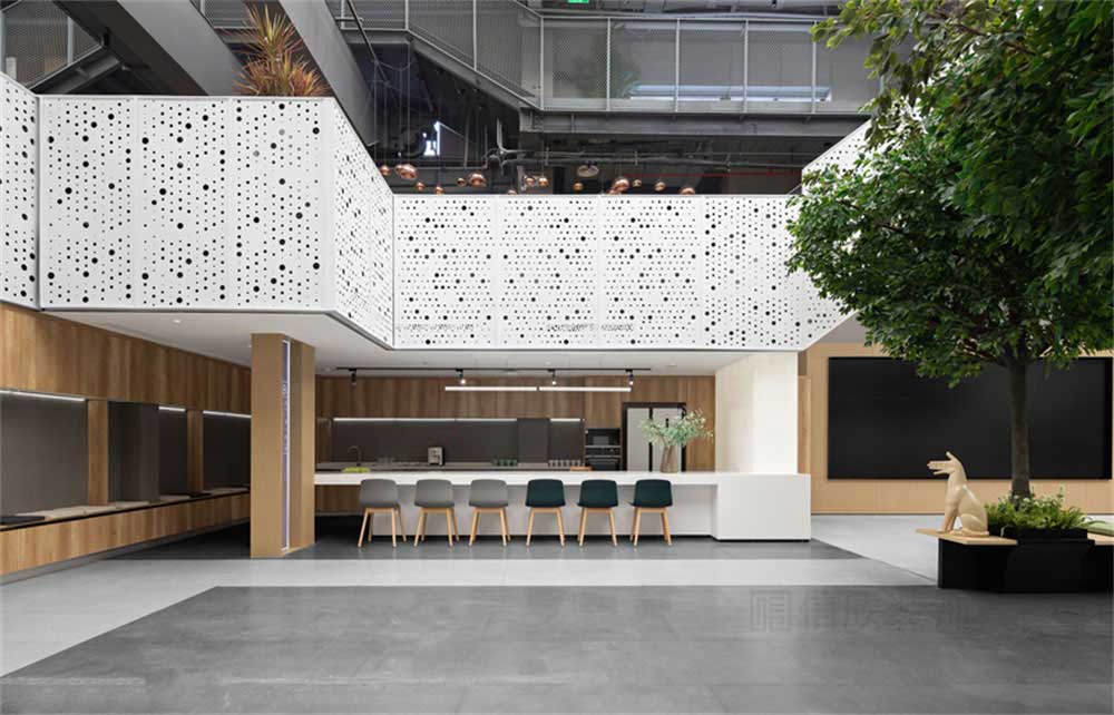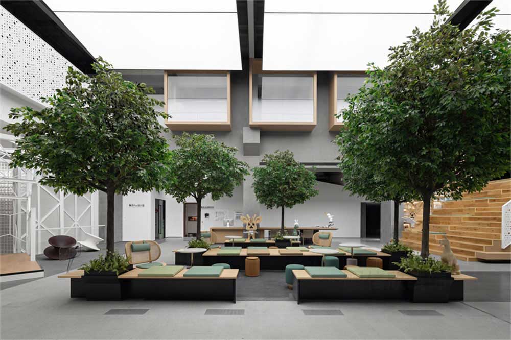 會客區(qū)域,整體打造出“陽光公園”的概念。綠色植物和長條的木制座椅,和草木綠的軟墊做出亂中有序的構(gòu)成感覺,給人有置身公園、享受戶外的空間感。