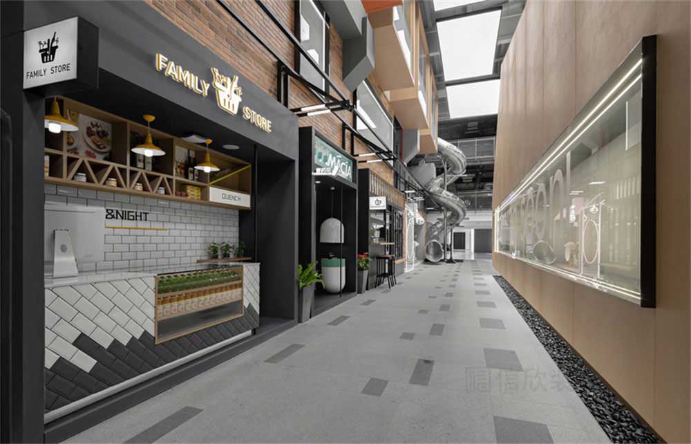 整個公區(qū)走廊做成室外街景,櫥窗的點(diǎn)綴,使人身臨其境。