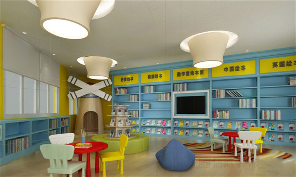 斜三角的休息區,通過天藍色的書架,風車的造型,白色的頂面,給孩子們打造出一個如希臘神話般神奇的小天地。
