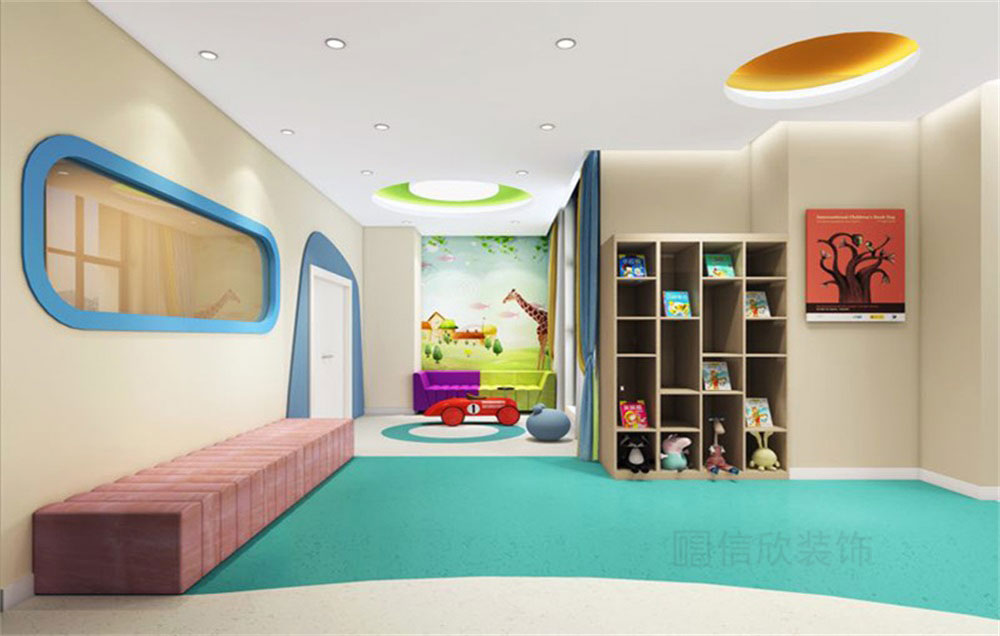 卡通的壁紙,顏色豐富的造型,打造出一個夢幻色彩十足的休息區。