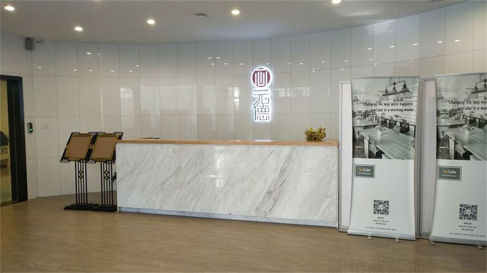 前臺天然大理石的設計,和地板相呼應,整體協調統一,有一種自然生長的紋理之美,頂面暖光的格柵造型,時尚中卻不缺乏溫情。