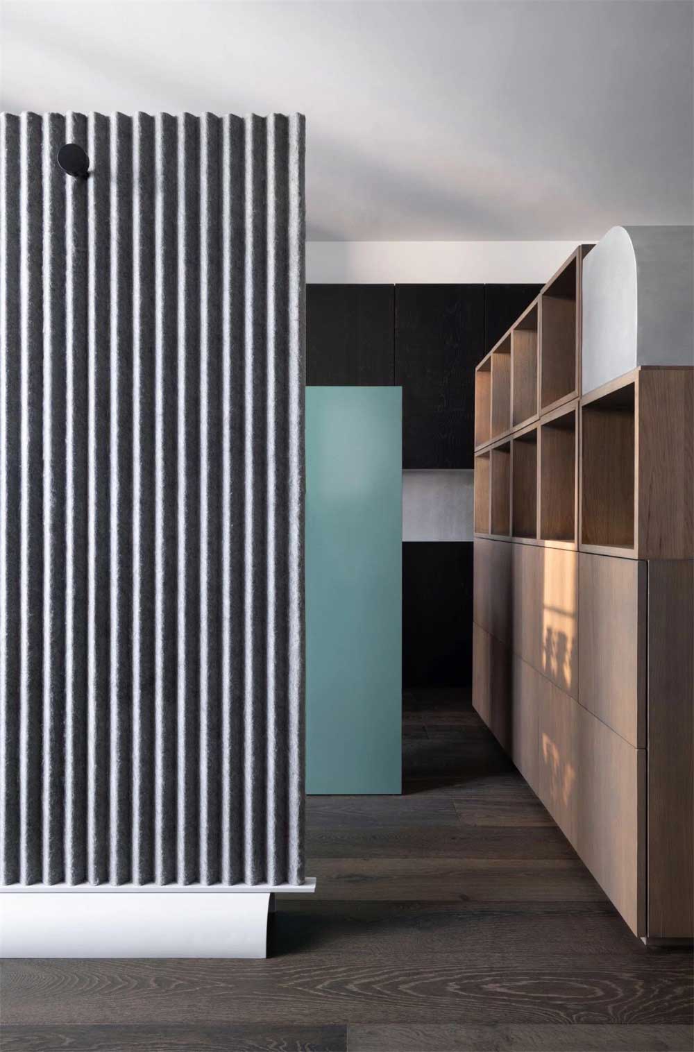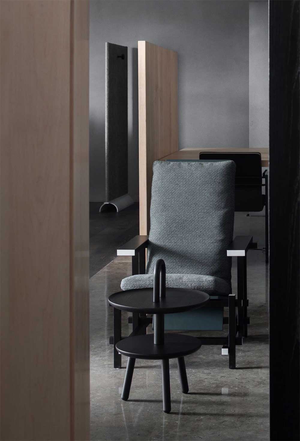 原木風(fēng)辦公室裝修設(shè)計灰色,灰色水泥澆筑和黑色長條形木板結(jié)合的會議室,原始粗獷,自然的設(shè)計理念。