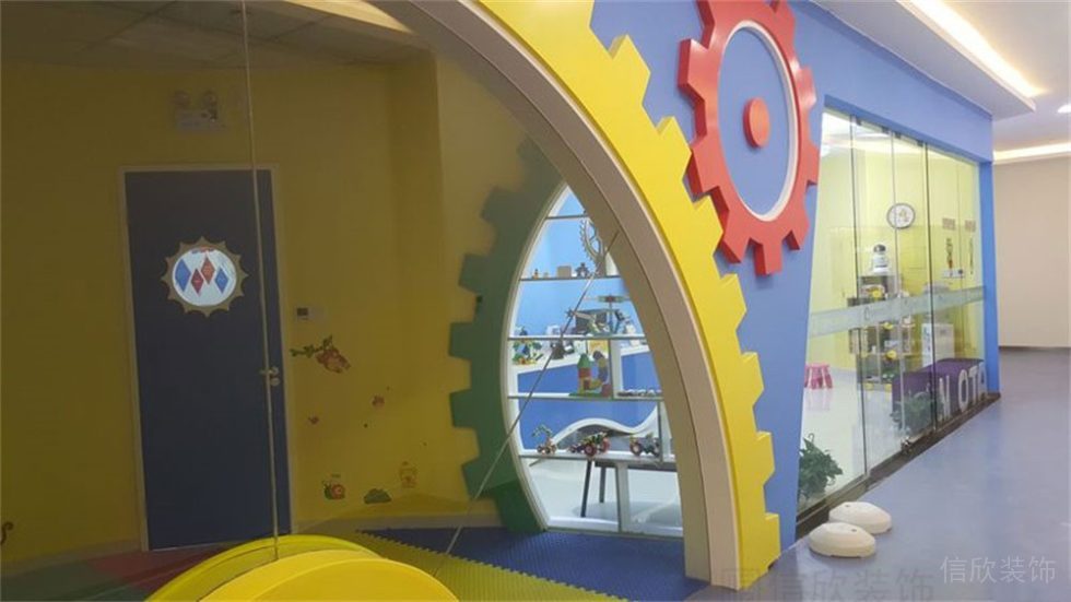 流線型的前臺,線條感十足,充滿想象,嵌入墻面的書柜,里面各式各樣的玩具,滿足了孩子們的好奇心和探索欲。