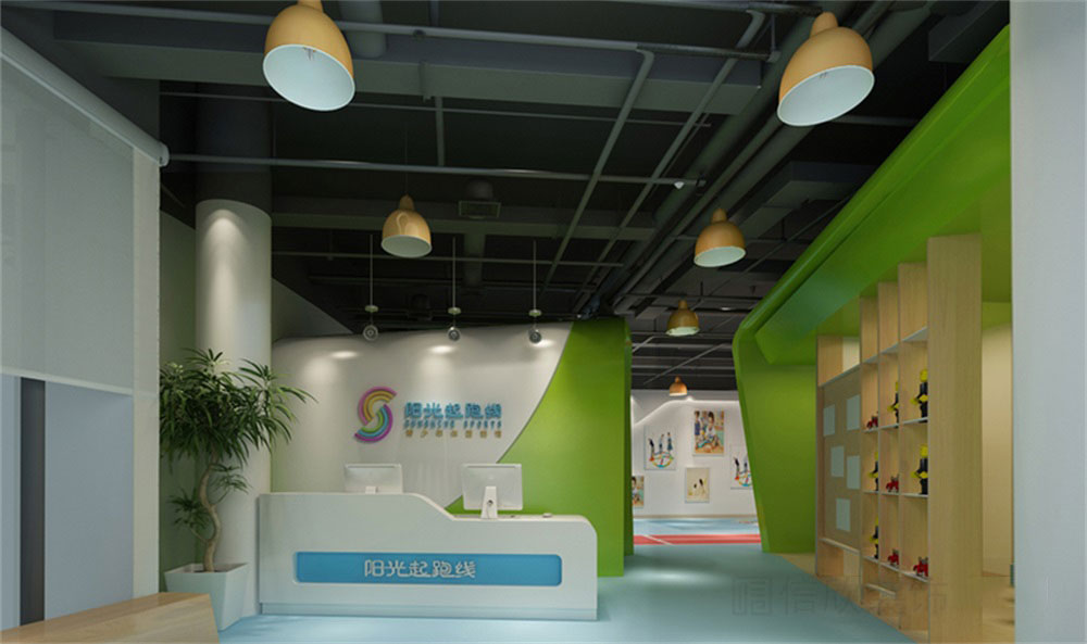 前臺的設(shè)計,采用簡單的藍色和白色的搭配,如天空般純凈明媚,旁邊翠綠色火車頭造型一樣的休息區(qū),生動形象,卡通活躍,深受孩子們喜愛。