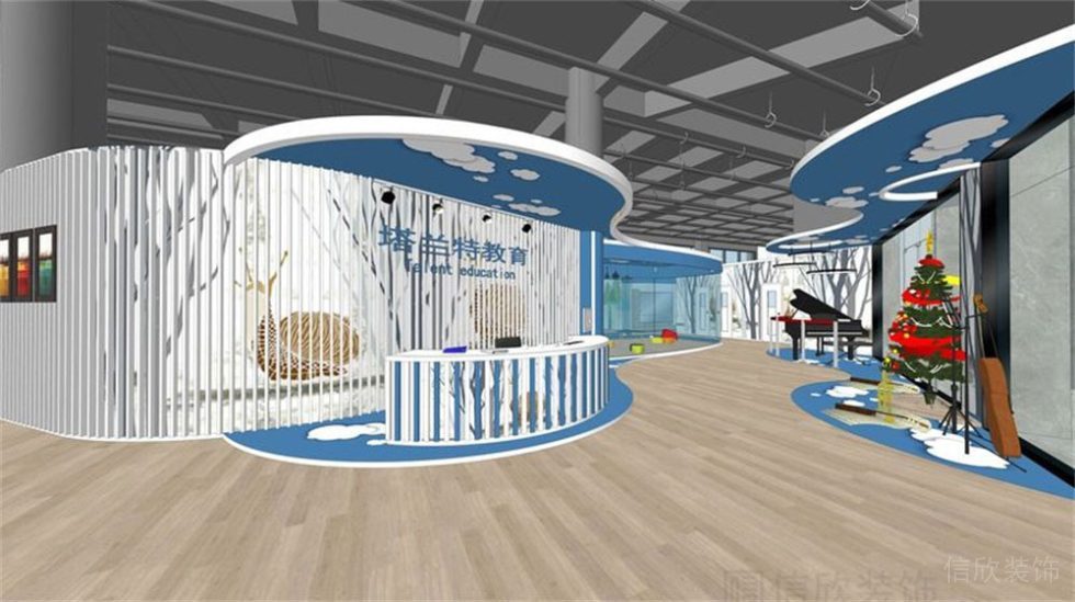 培訓中心門頭的設計,落地窗大開放式的玻璃,最大限度的把光線引入到了室內,使室內光線傳導性好,亮度充足,云彩壁紙的門頭和LOGO完美的融合,主題鮮明,特點醒目。