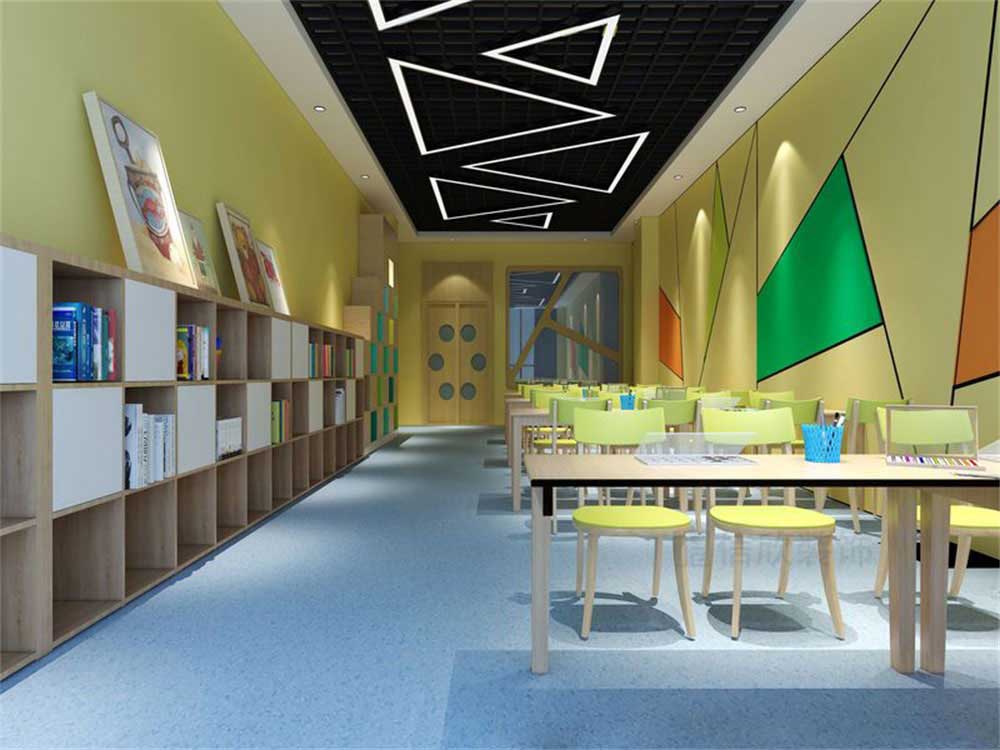 課室的設(shè)計(jì)上沿用幾何式的分割理念,黑色格柵頂上,用三角形的燈膜,讓頂面更具有設(shè)計(jì)感,黃色為主題,橙色和綠色的錯(cuò)落有致墻面,則有一種如七巧板一樣的童趣和創(chuàng)新意識(shí)。