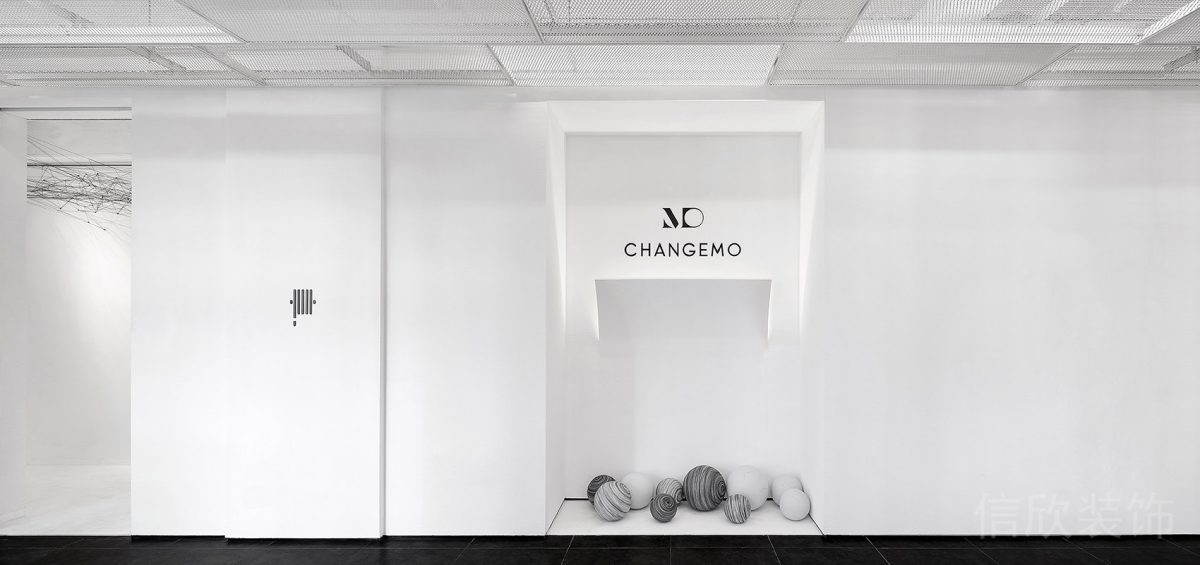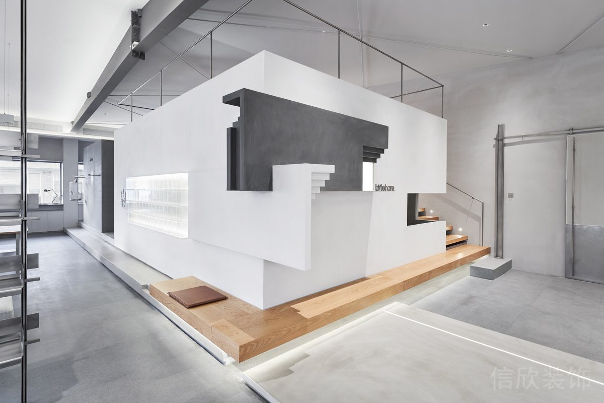 鏤空墻體過道裝修辦公室設計地臺灰色調地板黑白色調現代簡約風效果圖