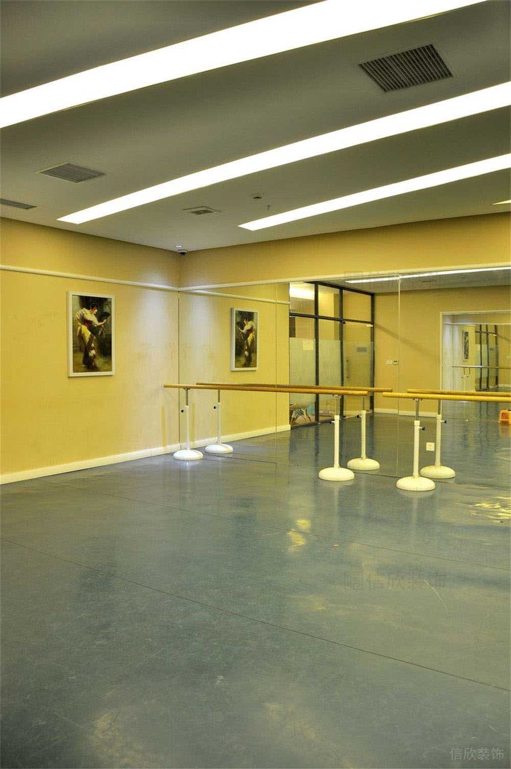 舞蹈室的設計,采用杏黃色的墻面,平頂帶發散式的燈膜,使整體感覺更加立體,大面積鏡面墻的應用,既能使空間的視覺感擴大,又能及時看到并糾正自己的舞蹈動作。
