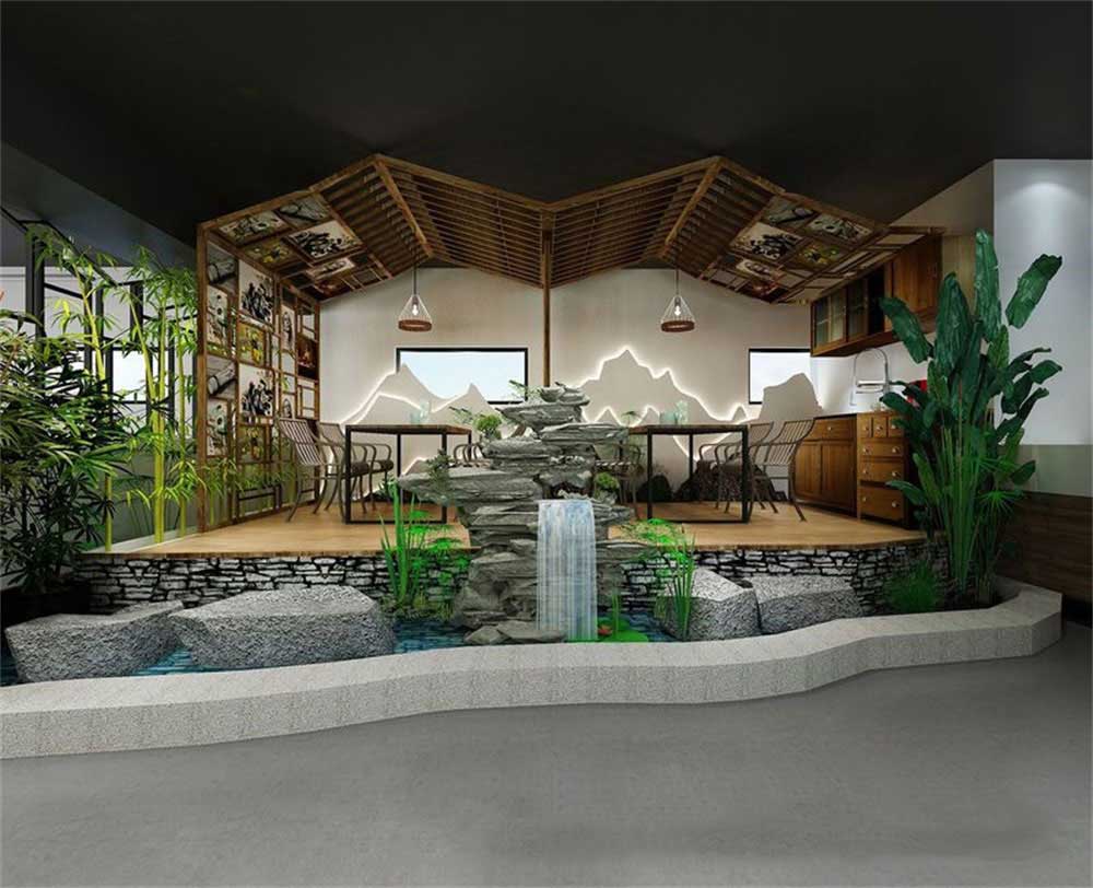 前臺及展示區(qū)背景墻采用不規(guī)則造型,設(shè)計(jì)師采用山水意境、現(xiàn)代的材料營造出一幅禪意水墨畫,遠(yuǎn)處的遠(yuǎn)山虛虛實(shí)實(shí),十分具有中式禪韻。