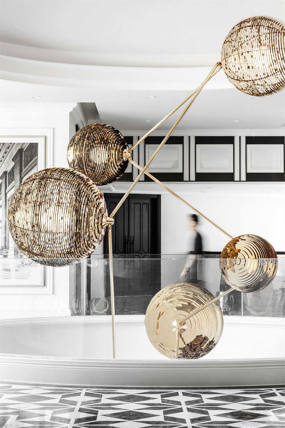 熊貓文化產業辦公空間的大廳,以黑白兩色的素雅設計,搭配球形的香檳金吊燈,體現出現代輕奢的優雅。