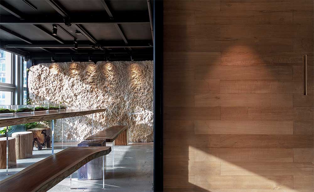 自然風(fēng)辦公室接待區(qū),原木風(fēng)的長條洽談桌椅,清新的綠植,風(fēng)化侵蝕感的墻面,欣賞著窗外的美景,享受著自然的味道。