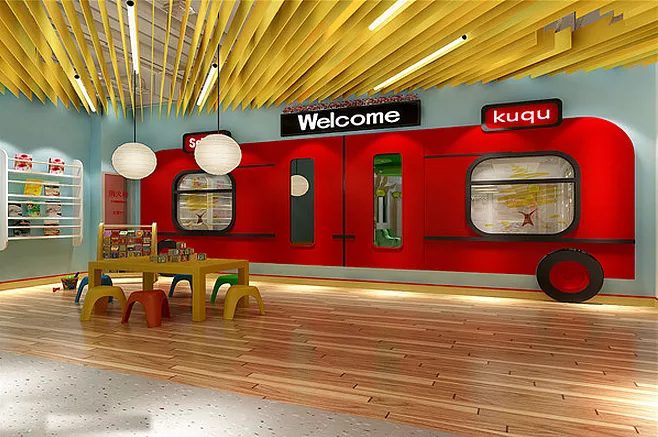 兒童娛樂區(qū)域童趣樂園采用搖椅和矮積木凳,橙色的環(huán)保墻繪標識鮮明積極。