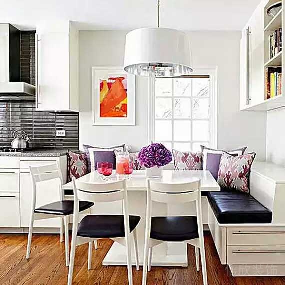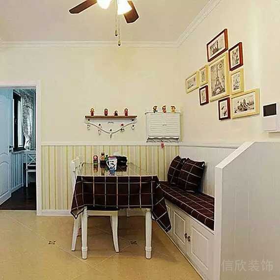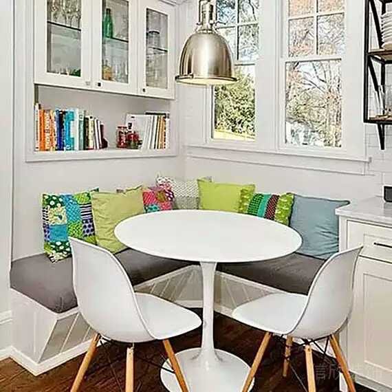 不過(guò)小戶(hù)型餐廳的卡座最適合裝在轉(zhuǎn)角了,如果你家也有這樣的轉(zhuǎn)角,千萬(wàn)不要浪費(fèi)了,把餐桌放這里啊,再加上幾張椅子就是一個(gè)完美的餐廳。這里不僅把卡座設(shè)計(jì)的非常小清新,而且墻壁上的設(shè)計(jì)也非常新穎實(shí)用。