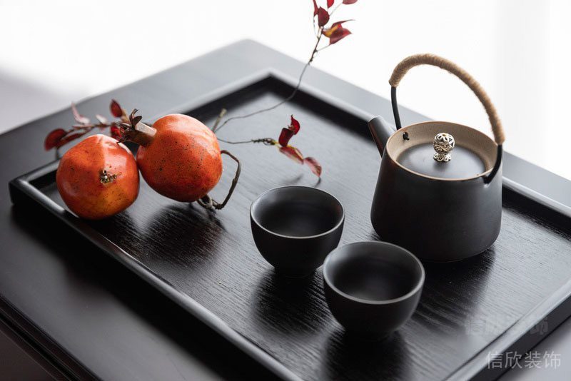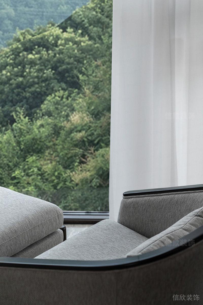 穿過玄關,進入過廳,左邊便是餐廳。實木布藝軟包座椅,極具設計感的扶手造型,碩果累累的鮮紅色石榴花藝,精致典雅的陶藝茶具,散發著濃郁的東方文化情懷。餐桌上方的半透明亞克力山形吊燈,與窗外的青山遙相呼應,在與自然的對話中,感受“久在樊籠里,復得返自然”的那份閑適與自在。