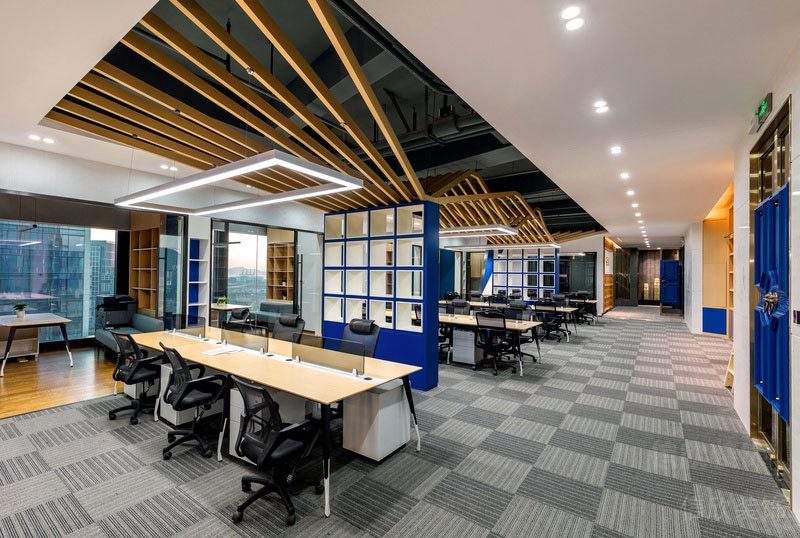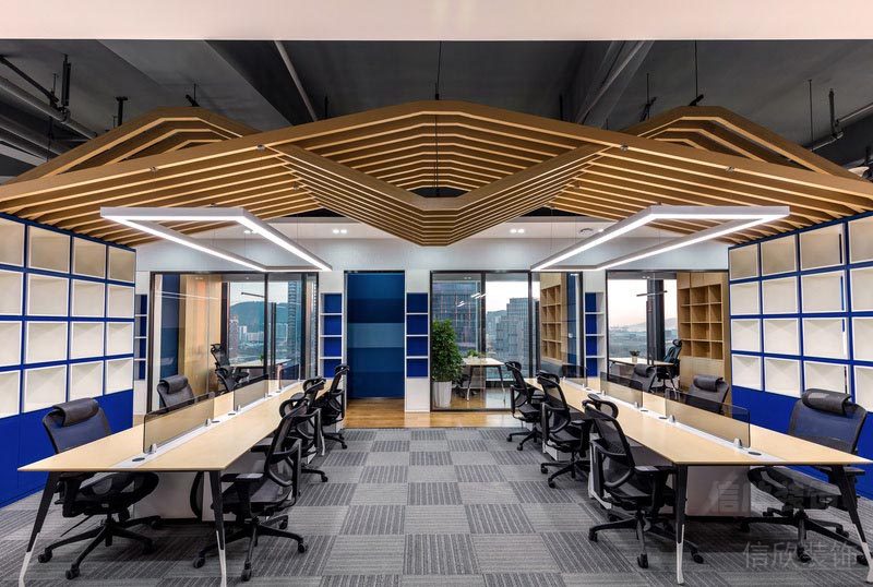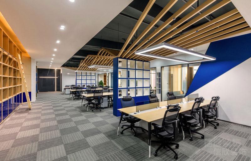 深圳南山現(xiàn)代中式風(fēng)格辦公室員工辦公區(qū)的天花,一種是顏色較深的木紋鋁扁通,一種是顏色較淺的木紋鋁扁通,兩種明度不一的木色、不一的紋理形成了對(duì)比,既統(tǒng)一又不單調(diào)。