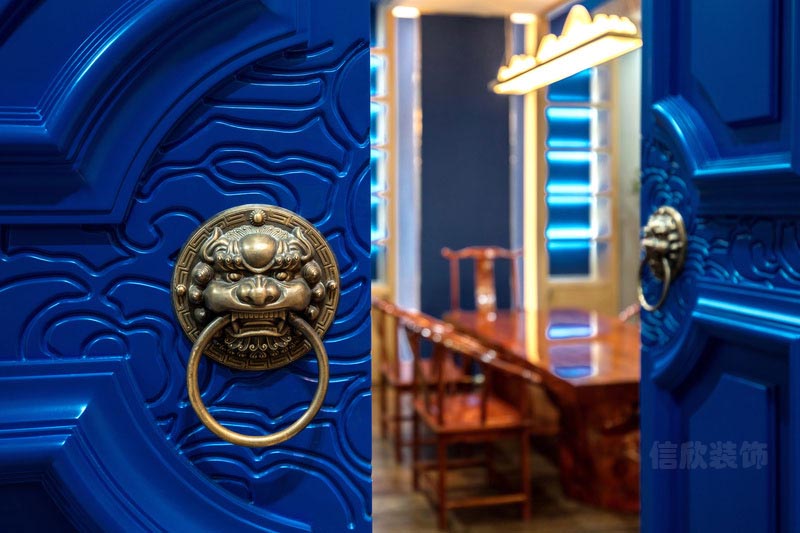 大門(mén)是以鋼化玻璃與寶石藍(lán)造型木相結(jié)合的,加以古銅的虎獅造型的門(mén)叩,運(yùn)用現(xiàn)代的手法和材質(zhì)還原了古典氣質(zhì),既顯示了中式韻味,又體現(xiàn)了現(xiàn)代風(fēng)格的與時(shí)俱進(jìn)。