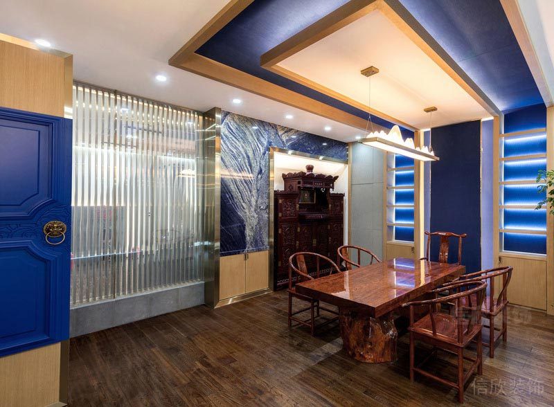 該項(xiàng)目以深厚的文化底蘊(yùn)、深詣美學(xué)意境去詮釋現(xiàn)代辦公空間,設(shè)計(jì)師將人文情懷及現(xiàn)代中式的氣韻作為勾摹空間的輪廓線,強(qiáng)調(diào)整體空間色調(diào)和形態(tài)傳遞,奠定非凡氣度,令空間擁有一種大氣敞闊又意境悠遠(yuǎn)的深意。位置坐落于深圳南山高新南七道粵美特大廈,是一個(gè)現(xiàn)代中式風(fēng)格辦公室裝修案例,入口門(mén)廳作為進(jìn)入辦公室的第一眼視覺(jué)空間,在設(shè)計(jì)和規(guī)劃上更關(guān)注場(chǎng)景營(yíng)造和縱深感,賦予辦公室更大的想象空間,寶石藍(lán)色調(diào)的藝術(shù)雕花門(mén)板彰顯出誘人的裝飾魅力,前廳接待區(qū)展示開(kāi)放、好客的形象,同時(shí)飽含中式傳統(tǒng)文化的審美意蘊(yùn),整體空間輕松雅致的氛圍,可讓工作人員和訪客在此愉悅地開(kāi)展工作。