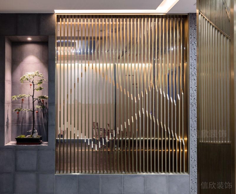 深圳南山現(xiàn)代中式風(fēng)格辦公室的玄關(guān)觀景區(qū)高低起伏的不銹鋼造型隔斷,像是一座座連綿不斷的山巒,后面是通電玻璃,在透明情況下可以在觀景區(qū)通過(guò)玻璃看到外面的海景,將此處的視覺(jué)空間延伸出去,若打開(kāi)通電玻璃開(kāi)關(guān)則可關(guān)閉透明狀態(tài),保護(hù)了董事長(zhǎng)室的隱私性,既達(dá)到視覺(jué)的通透性,又滿足了區(qū)域功能的劃分。不銹鋼隔斷在陽(yáng)光的照耀下,通過(guò)反射可以將此處變成一處?kù)陟谏x的金屬風(fēng)景。