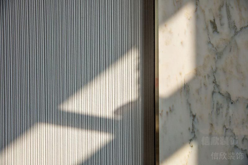深圳南山現(xiàn)代中式風(fēng)格辦公室玄關(guān)觀景區(qū)屏風(fēng)局部的墻面則是用較現(xiàn)代但又不失古典的水泥石,既延伸了員工辦公區(qū)的現(xiàn)代風(fēng)格,又不破壞入門(mén)過(guò)道空間的調(diào)性,保留了入門(mén)過(guò)道空間的完整性。董事長(zhǎng)室門(mén)垛兩旁傳統(tǒng)祥云的文化圖騰,水景墻面豎貼的灰瓦,及三座白玉的石獅,極大豐富了空間的表情,更加增加了現(xiàn)代中式文化的氣息。